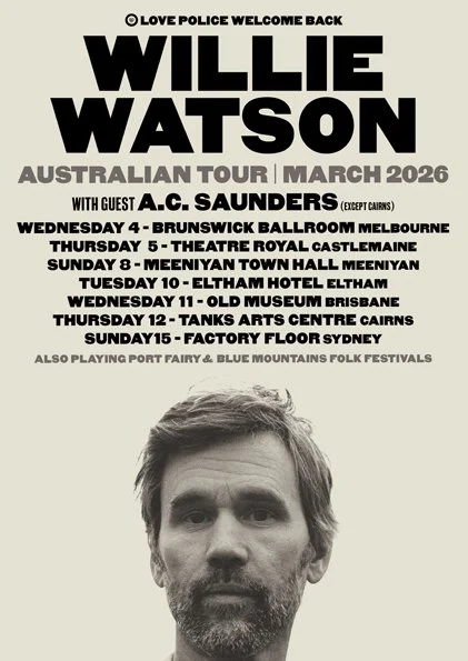 This March, Love Police proudly presents Willie Watson as he returns Down Under for the tenth or so time. Supporting Willie Watson on his Australian journey is Melbourne-based guitar slinger, song singer, chain blinger A.C. Saunders.