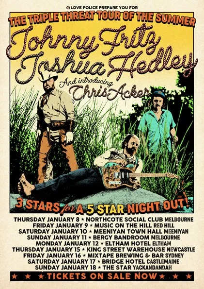 Love Police are thrilled to announce the return of two of Nashville’s most beloved country storytellers —JONNY FRITZ and JOSHUA HEDLEY— for a run of special Australian shows in January 2026, joined by their good friend and kindred spirit CHRIS ACKER.
